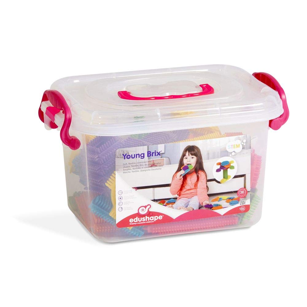 Remember Bristle Blocks?? Well, these are they! Safe, soft and uniquely flexible knobby shapes interlock with each other from practically every side. This set Includes 33 pieces to build houses, robots, furniture and more. Plenty for your toddler to start building! Includes a plastic bucket for easy clean-up and storage. Developmental Qualities include Fine Motor Skills, Reason, Logic, Hand Eye Coordination, Tactile Sensory Development. An EZ Grasp product.