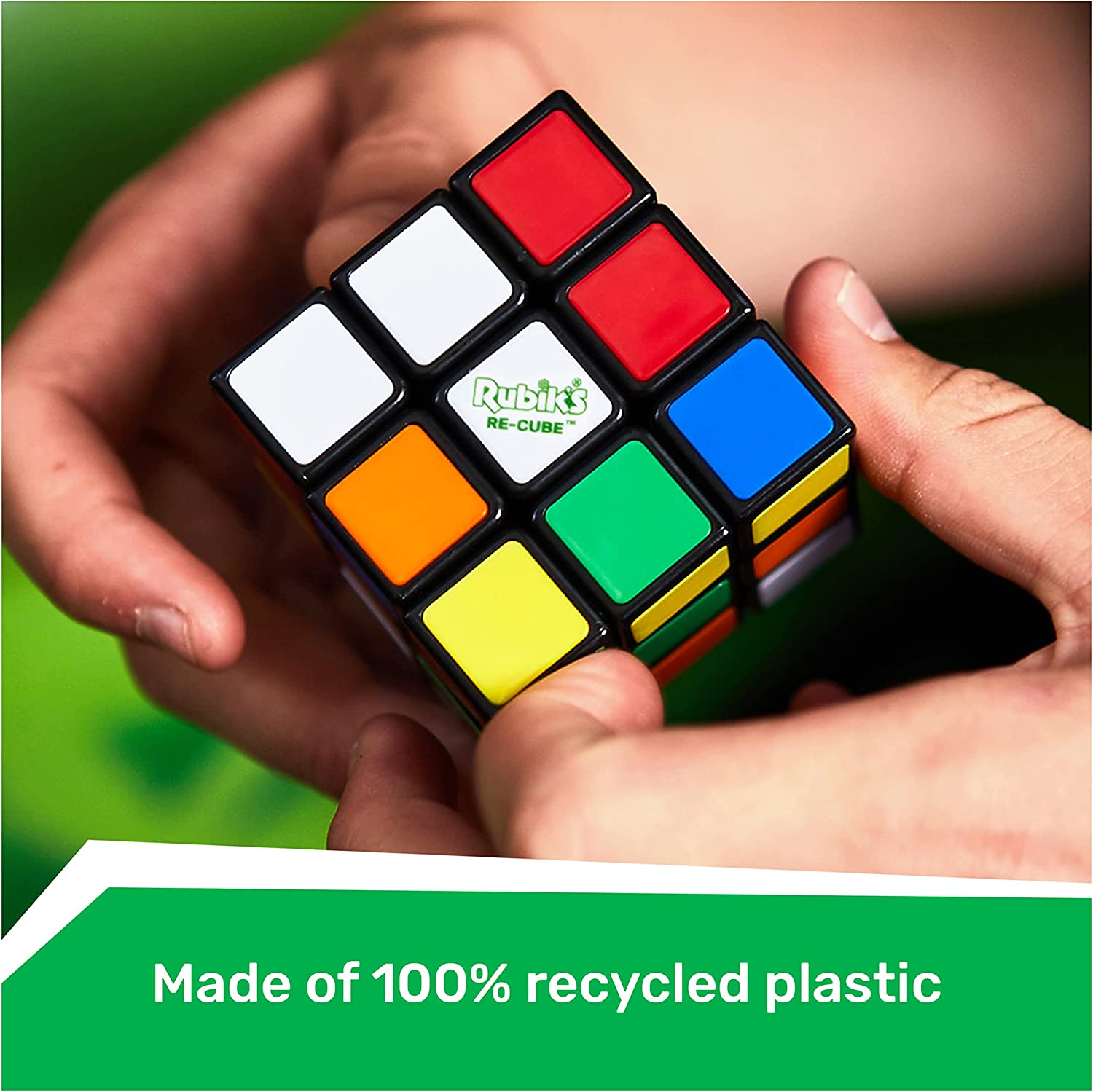 The Rubik’s Re-Cube is the classic color-matching puzzle now made with 100% recycled plastic and packaged in a 100% sustainable package made of un-bleached paperboard. This lightweight material is created from all natural ingredients such as wood pulp. It is FSC certified, meeting the top criteria for sustainability standards. The new and improved Rubik’s Cube 3x3 features a mechanism that results in smoother, faster, and more reliable play. The traditional stickers have been replaced with plastic tiles which means no fading, peeling, or cheating!