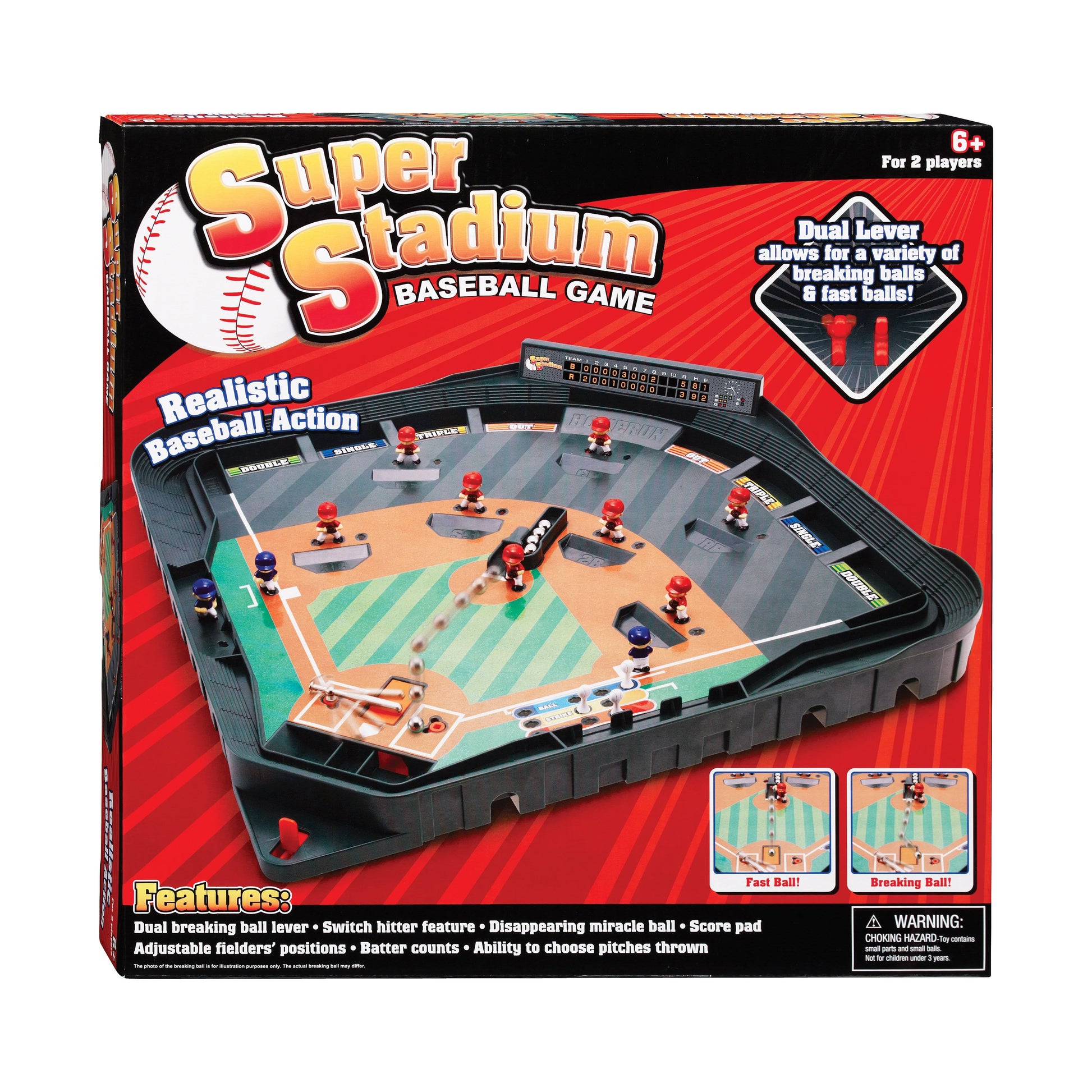 Realistic Baseball Action! Strike out your opponent! Pitch fast balls and curve balls. Throw a variety of breaking balls at different speeds. Your opponent won't be able to predict the pitch you will throw! A unique magnetized infield creates ball movement when the pitches are thrown. Spring-loaded bat Counter for balls, strikes and outs. Hit singles, doubles, triples, foul balls and home runs! Choose to bat right or left-handed. Strategically position fielders. Large 16 1/2" X 16 1/2" playing field. Contents: Playing field game board, bat, pitcher, three base runners, seven fielders, three score pins, five balls, score sheet, instruction manual