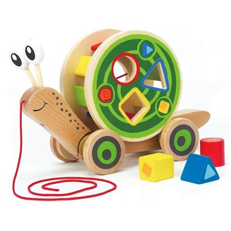 This multi-tasking snail totes a shell full of wooden blocks as he tags along behind you. Lighten the load by removing the colorful shape sorter, and he’s ready to roll alone.